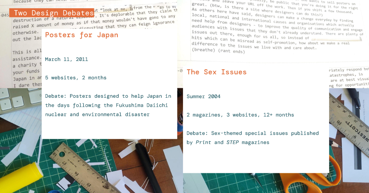 The texts I worked with are derived from website comments (think Design Observer, Speak Up, AIGA Voice, Eye magazine’s blog, and others) as well as Letters to Editors (think Print magazine). I discussed two specific design debates (see image above) as well as the theory, ethical challenges, and process for my study.
